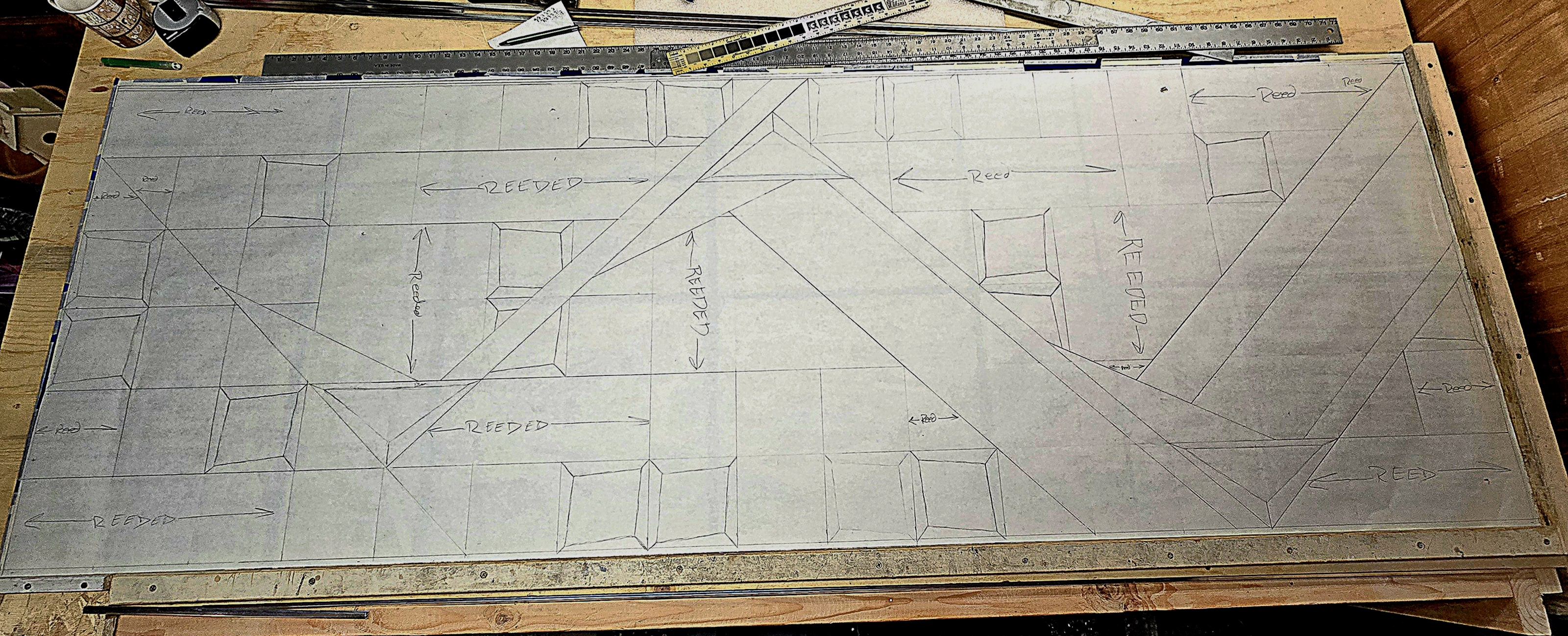 Click on each image to see the design better. I had to darken images some to be able to see the line work. Next step will be cutting clear 1/4 in glass for the sections that will be hand beveled. I will continue showing pictures as I progress.